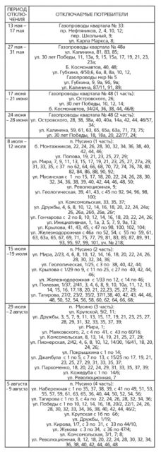 Ниже представлен график отключения газа в городе Салават в 2019 году.